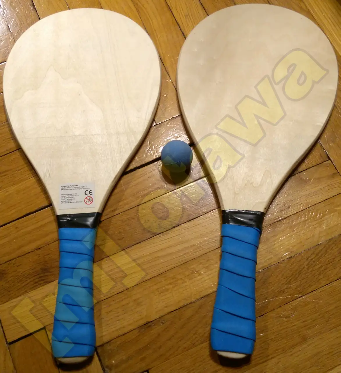 Nowe, nigdy nieużywane drewniane rakietki plażowe seven for 7 z piłeczką (całkowita długość rakietek około 43 cm) + gratis (używane rakietki do tenisa stołowego z dwoma ping pongami). Całość widać na zdjęciach.